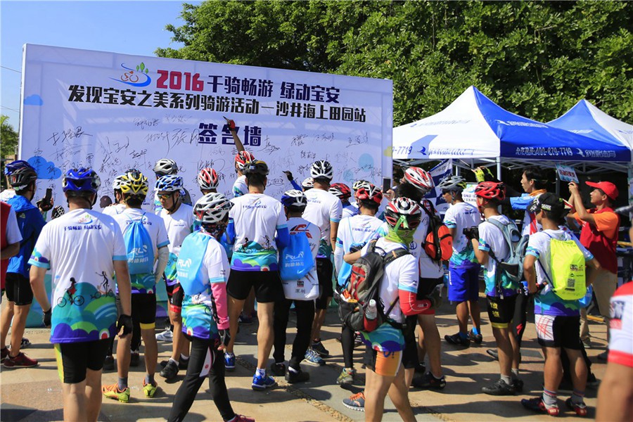 2016年7月24日,晴空万里,艳阳高照,来自全市的8个自行车俱乐部和4个企业代表队,共约200多人齐聚深圳沙井海上田园,参加了今天的骑行活动。“千骑畅游,绿动宝安”发现宝安之美系列骑行活动全年共举行6场,沙井海上田园站是第二场。本次活动沙井街道办和区文体旅游局高度重视,赛前举行了十几个部门参加的协调会。
